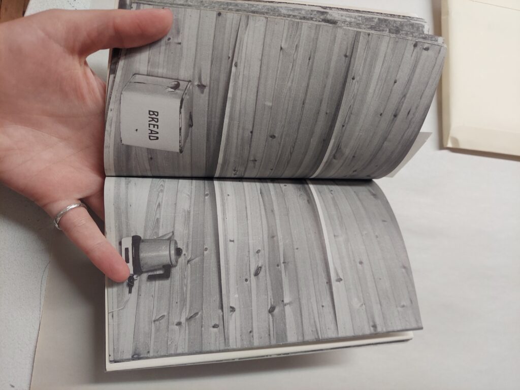 Chinese Whispers is a collaborative project of Helen Douglas and Telfer Stokes of Weproductions. The process of its creation relates to its title, which refers to a game of information being passed along and distorted, also known as telephone. A strong point of view that moves us into a space in a rural setting, zooming in and out on specific views and objects, and shifting saturation. The viewer moves though the book in a way that feels predetermined, like a line of ants moving in a set path. There is a sense of narrative as we zoom in and out of a fly on a bread box, or a package of cabbage seeds and cabbage leaves. A piece of sod was cut in the same dimensions as the book, and reproduced in full bleed photographs, with the front cover being the grass, and the back cover being the roots and soil. We enter the book as an unassuming ant moving through the grass, and find an intimacy and familiarity with the objects and spaces in the pages.