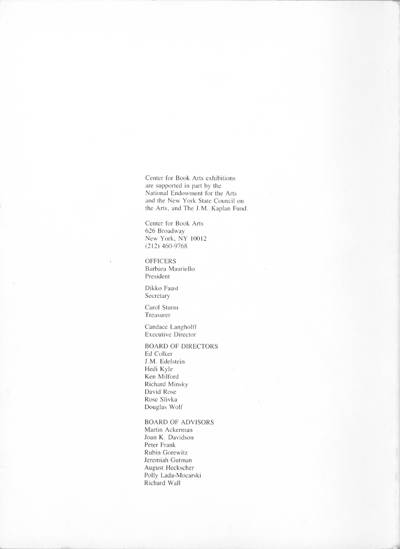 Support for the Center for Book Arts’ visual arts programming is provided, in part, by the New York State Council on the Arts, with the support of Andrew Cuomo and the New York State Legislature, and by public funds from the New York City Department of Cultural Affairs in partnership with the City Council.