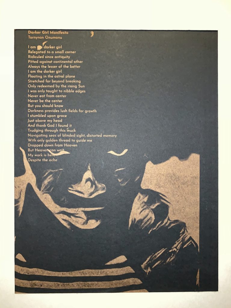 Darker Girl Manifesto is a self portrait and poem which serves to uplift and center Black Femmes who traditionally find themselves on the fringes of society. It pays homage to the broadsides of Dudley Randall’s Broadside Lotus Press and sings a similar tune to that of “the darker brother” in Langston Hughes’ “I, Too, Sing America.”