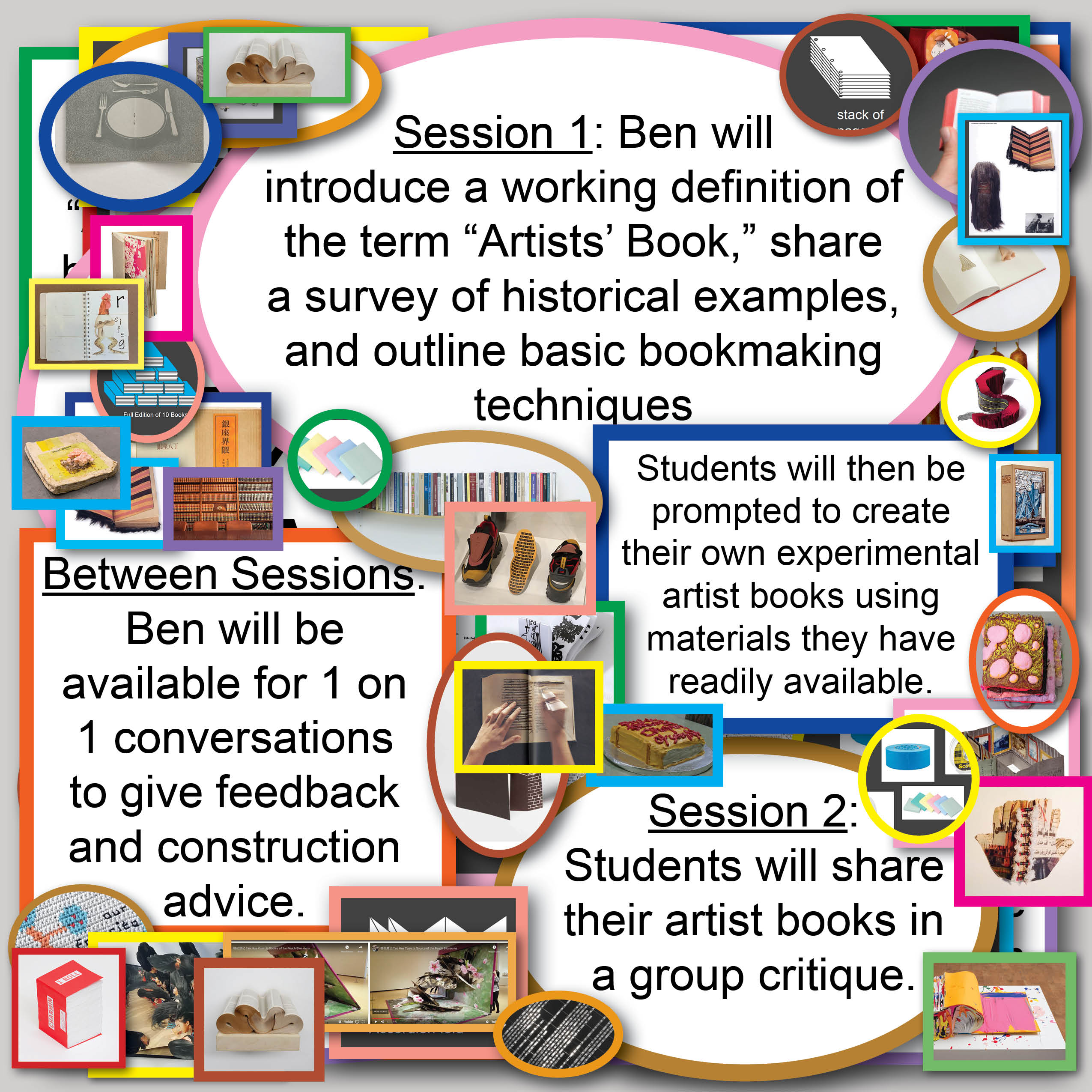Between sessions, students will be prompted to create their own experimental artists’ books using materials they have readily available around them. Ben will be available for one-on-one chats over zoom to go over ideas, plans, in-progress work, etc.